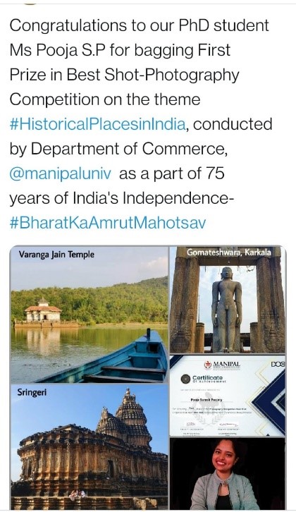 15) Ms Pooja SP (Clinical Embryology) PhD scholar received First Prize for Photography competition-Best shot on 30 April 2021.
