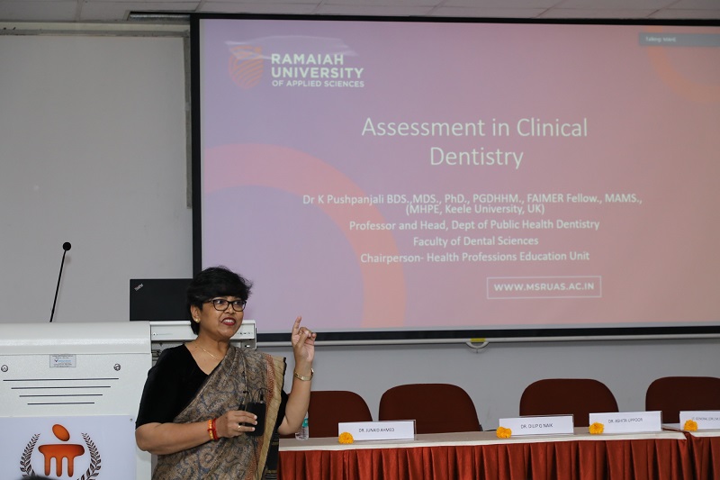 Dr. Pushpanjali, Professor and head department of Public Health dentistry, Faculty of Dentistry, Ramaiah University, spoke on the topic "Assessment in Clinical Dentistry". She gave clinical demonstrations and conducted an engaing session on the importance of aligning the outcomes/competencies to teaching and assessment. She introduced the gathering to the various criterion involved in developing objective competency-based assessment.