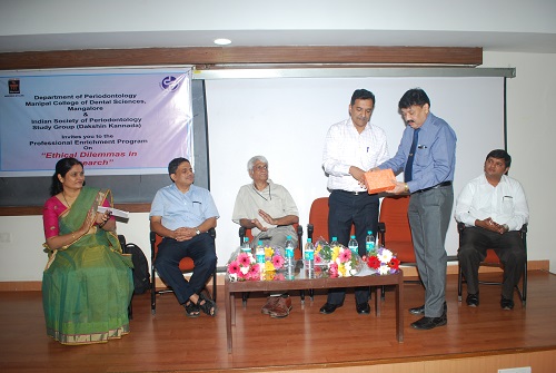 The Department of Periodontology, Manipal College of Dental Sciences Mangalore, in collaboration with the Indian Society of Periodontology, Dakshin Kannada study group, conducted a Professional Enrichment Program titled “Ethical Dilemmas in Research” on the 14th February 2015, at Manipal College of Dental Sciences, Attavar Mangalore. The program was attended by 120 delegates including postgraduates and faculty from colleges in and around Mangalore. Dr. Dilip G Naik, Dean MCODS Mangalore was the guest of honor for the occasion. Dr. Biju Thomas, the National President of the Indian Society of Periodontology was the chief guest. The Convener of Indian Society of Periodontology, Dr. Sharath KS Prof & Head, Department of Periodontology Srinivas Institute of Dental Sciences was also present on the occasion. Dr Ashita Uppoor Prof & Head Dept of Periodontology welcomed the gathering. The speakers for the program were Dr. Joseph Thomas, Professor Department of Urology, Kasturba Medical College Manipal, who spoke on “Research Ethics”, and Dr. MK Unnikrishnan, Professor and Head Department of Pharmacy Practice, Manipal College of Pharmaceutical Sciences Manipal who enlightened the participants on “Publication Ethics”. Both the lectures were well appreciated by the participants.