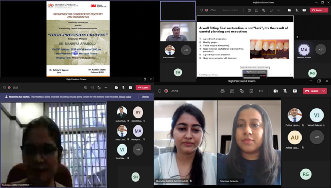 Dr. Manikya Arabolu, Clinical specialist, 3M Sciences was the resource person for the continuing dental education program titled “High-Precision crowns” held on 29th January, 2022.