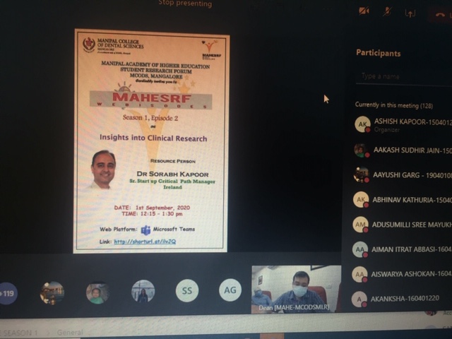 On 1st September, MAHESRF conducted the Season 1 , Episode 2 of the series called WEBISODES. It was a webinar titled-“Insights into Clinical Research” by Dr.Sorabh Kapoor . It was open to students from all the years. With the support of the Dean, Associate Deans, Head of the departments , Staff members and Staff mentors- it was conducted successfully on Microsoft Teams. The event started at 12:15 pm and was attended by approximately 170 participants. Having an experience of more than 19 years in the field of Healthcare which includes an experience of more than 14 years in Clinical research operations, Sir is working as a Senior Startup Critical Path Manager in Ireland. Currently sir is working on the multiple Covid Clinical trials. Sir very systematically and patiently explained the flowchart of the various steps involved in the Research trial and how a drug is released in the market. Each and every step was elaborated and very well explained to ensure that the participants understand it very well. Sir even highlighted about the process to conduct trials during pandemic situations to meet the emergency demands. This was followed by the Q&A session in which students were free to ask questions/doubts. Sir very patiently answered all the questions and made sure that none of the participants had any query unanswered. The welcome address was given by Debolina Bishayi, Joint Secretary -MAHESRF and the event was moderated by Dr Aakash Jain-Secretary , MAHESRF. The event got over by 2:00 pm and the participants were satisfied and had positive reviews for the event.