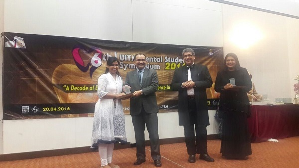 A team of seven delegates represented Manipal College of Dental Sciences, Mangalore, Manipal Academy of Higher Education at the Dental symposium 2016 (20th April) that was hosted by Faculty of Dentistry, Universiti Teknologi Mara. The team included faculty Dr Nidhi Manaktala, 3 postgraduate students Dr Shakthi Dorai, Dr Akanksha Singhal, Dr Zeena DCosta and 3 undergraduate students Miss Sana Chawla, Miss Ansu Ann Abraham and Miss Tanya Sawhney. The symposium started with prayers to the almighty and a welcome address by the founding Dean Professor Dr Mohamed Ibrahim Abu Hassan welcoming the national and international delegates alike. The program started well within the schedule with oral and poster presentations taking place simultaneously. International delegates from University of Gadjah Mada, Indonesia and Coorg Institute of Dental Sciences, India also participated in the symposium. There were a lot of interesting studies presented by the Malaysian students and the international students. The closing ceremony of the symposium started around 5 pm with Miss Ansu and Dr Shakthi bagging the first and second prizes in oral and poster presentation competitive categories respectively. The closing ceremony was a mix of the cultural heritages of Malaysia thus making it a grand success.