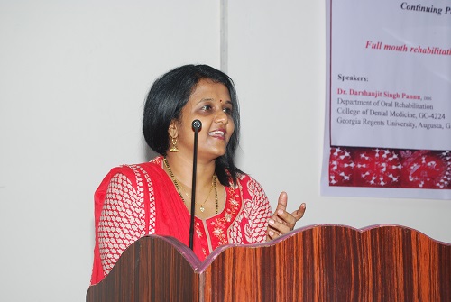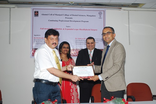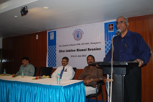 90 batch, Dr. Rahul Wagle, was the masters of the ceremony, Welcome address was given by Dr. Vidyasaraswati (presently Prof. & Head, Conservative Dentistry, MCODS, Manipal) and vote of thanks was rendered by Dr. Ashwini Rao, (presently Prof. & Head, Public Health Dentistry, MCODS Mangalore). All the faculty were honoured with flowers. Dr. Aboobakar Siddique raised the toast and did a splendid presentation. The Pro VC, the Dean, MCODS Mangalore and the Director Alumni Relations addressed the audience.