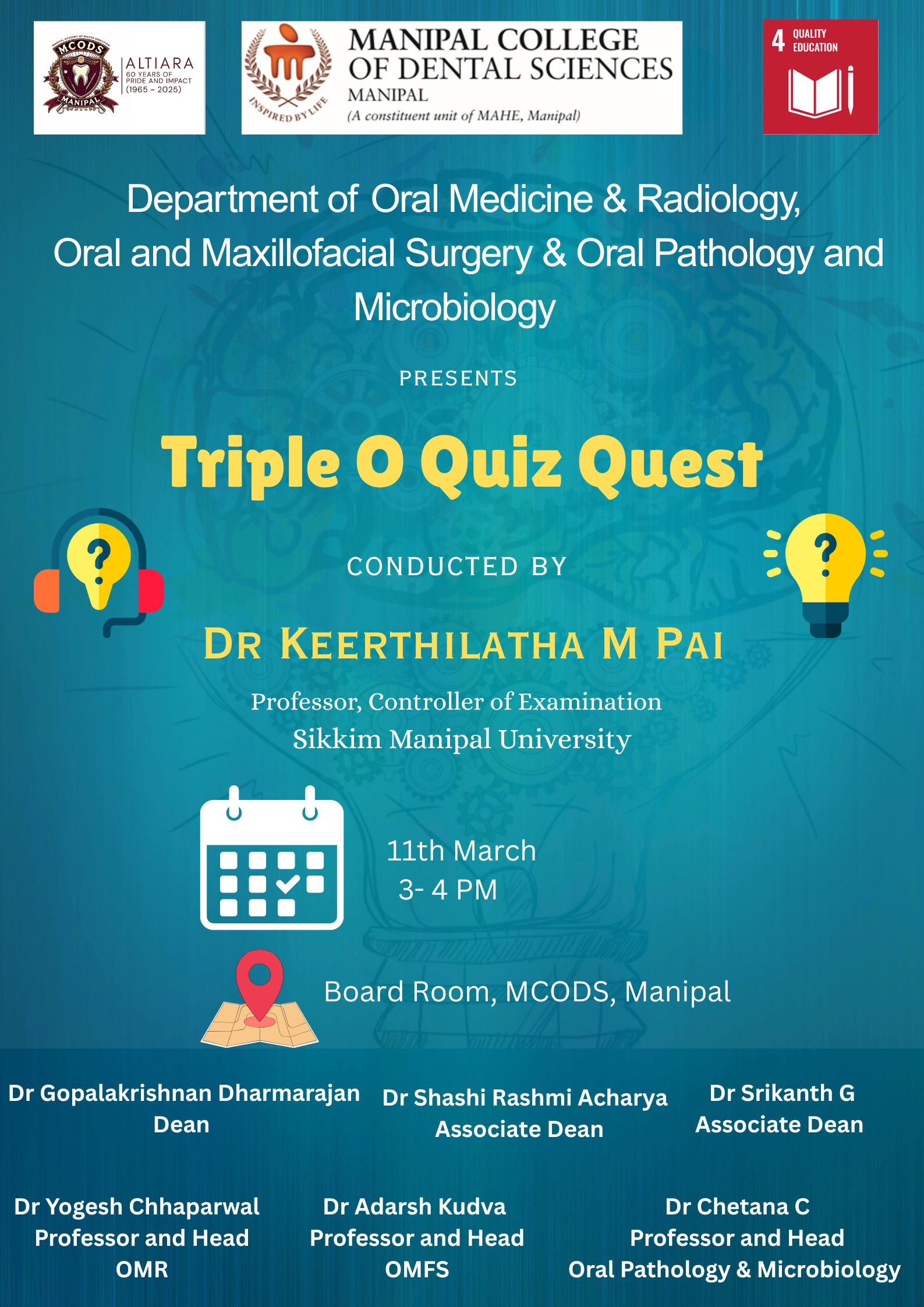 The Department of Oral Medicine and Radiology organized the Triple O Quiz Quest on 11th March 2026 for postgraduate students from the Departments of Oral Medicine and Radiology, Oral and Maxillofacial Surgery, and Oral Pathology of MCODS Manipal and Mangalore campuses. The event was conducted by Dr. Keerthilatha M. Pai, who served as the Quiz Master.