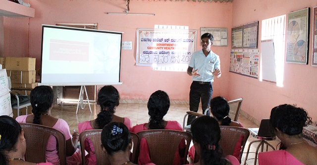 Student representative Ms. Kavya welcomed the gathering. Dr. Malathi G Nayak spoke regarding the theme of World Cancer Day “I am and I will”. The students performed a skit regarding the common risk factors and warning signs of cancer. Mr. Ranjith, a student representative delivered a session on common cancers in community and myths and taboos related to cancer. Dr Narasimha Nayak highlighted on the supportive schemes and services available for cancer patients and the role of ASHA workers in cancer prevention. Dr. Malathi G Nayak demonstrated techniques of breast self-examination and also addressed the doubts raised by the ASHA workers. The session was concluded by the open discussion facilitated by Ms. Kiran Mendonca, IV year BSc Nursing student. A total of 18 members participated in the program and they identified the program as effective and motivating. The programme was coordinated by Mrs. Regeena Mathew, Lecturer, Dept. of Community Health Nursing, MCON, Manipal.IV