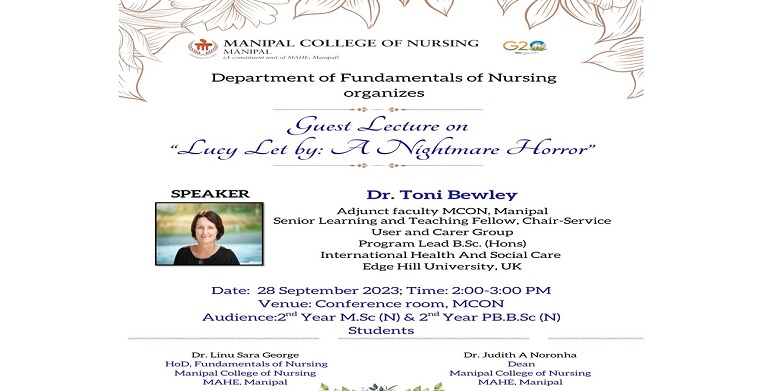 Dr. Toni Bewley, the Adjunct Faculty of MCON and Senior Teaching Fellow and Program Lead, School of Nursing, EdgeHill UK, deliberated a session on "Lucy Letby: A Nightmare Horror" to 2nd year MSc, 2nd-year PBBSc and MCON Faculty members on 28.09.2023 between 2.00 & 3.00 pm. She narrated the incident of a nurse named Lucy Letby, who was found guilty on August 18, 2023, of the murder of seven babies and attempted murder of six other babies while she worked as a nurse on the neonatal unit of the Countess of Chester Hospital. She further discussed the importance of vigilance and whistleblowing as a Health Carer. She further stressed to the participants to continue striving for excellence in patient care and hold themselves accountable for wrongdoing or malpractice.