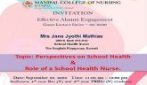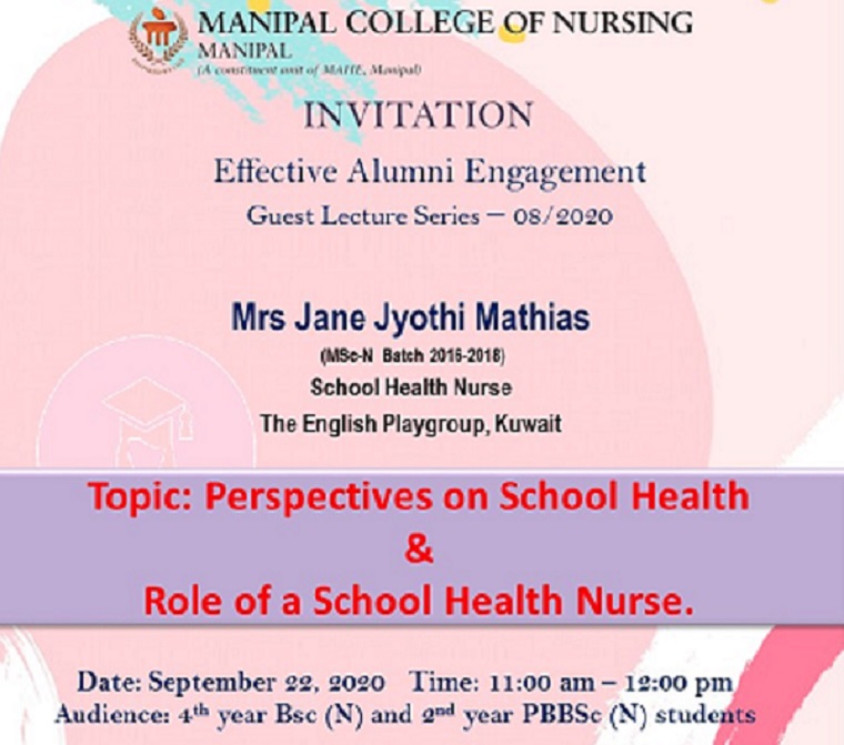 Department of Community Health Nursing, Manipal College of Nursing Manipal has organized alumni guest lecture on the topic Perspective on School health and role of School Health Nurse on 22 September 2020 between 11 am – 12 pm. Mrs Jane Jyothi Mathias, School Health Nurse, The English Play Group (alumnus of MCON MSc-N- 2016-2018 batch) discussed on the role and responsibilities of a School Health Nurse. She highlighted on the medications and equipment needed in School for providing basic nursing care for children in school and also regarding referral to the ministry health authority. She shared her experiences of being a School Health Nurse and the criteria for aspiring a job as a School Health Nurse. The session was deliberated using Microsoft teams platform. Total 127 participants including faculty members and students from 4th year BSc(N) and II year PBBSc (N) attended the session. This program was coordinated by Mrs Reshma R Kotian, Lecturer, Manipal College of Nursing Manipal, MAHE, Manipal.