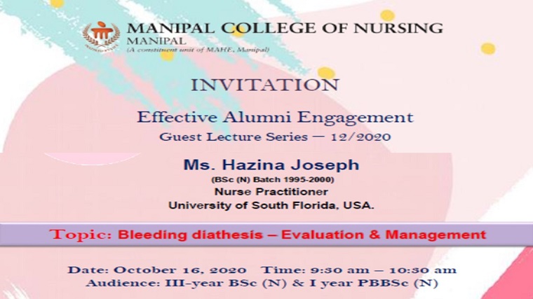 Department of Child Health Nursing, Manipal College of Nursing, Manipal Academy of Higher Education, Manipal organized an Alumni Guest Lecture on “Bleeding Diathesis – Evaluation & Management” on October 16, 2020, between 09.30 am & 10.30 am for undergraduate nursing students through Microsoft Team Platform. Ms Hazina C Joseph, Nurse Practitioner, University of South Florida, USA and alumna (BSc Graduate 1995-2000 batch) of MCON, Manipal was the speaker for the session. She discussed the physiology of hemostasis, evaluation and management of common bleeding disorders such as Hemophilia and Von Willebrand disease. She also sensitized the students and made the session live with case-based scenarios of different age groups.