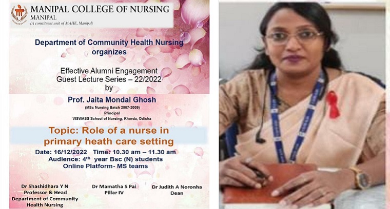 Department of Community Health Nursing, Manipal College of Nursing Manipal has organized an alumni guest lecture on the topic 'Role of a Nurse in Primary Care Setting' on 16th December 2022 between 10.30 am – 11.30 am. Prof Jaita Mondal Ghosh, Principal, VISWASS College and School of Nursing (alumnus of MCON MSc Nursing - 2007-2009 batch) discussed the role and responsibilities of the nurse as a nurse leader, nurse manager, and change maker. She also discussed on an expanded role as CHO in the healthcare delivery system. The session was deliberated using the Microsoft team’s platform. A total of 82 participants including faculty members and students from 4th year BSc(N) attended the session. This program was coordinated by Mrs. Reshma R Kotian, Lecturer, Manipal College of Nursing Manipal under the guidance of Dr. Shashidhara Y N, Prof and HOD, Department of Community Health Nursing MCON, MAHE, Manipal.