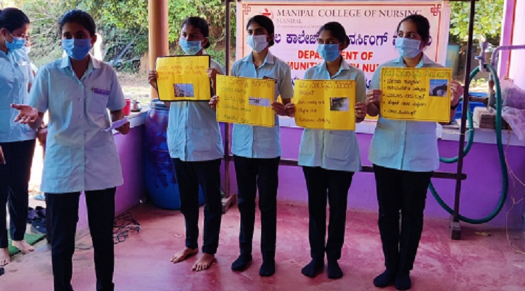 Second Year BSc Nursing students (Batch-III) along with the faculty, Department of Community Health Nursing, MCON, MAHE organized an awareness program on Pollution prevention on 29th December 2021 at 11 am in Vishweshwar Nagar, Hirebettu.