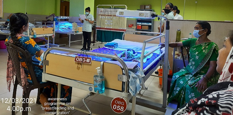 As part of International Women’s Week, the Health and Social Welfare Committee of Student Nurses Association, Manipal College of Nursing, MAHE, Manipal, organized an awareness programme on Breastfeeding and Immunization at Women and Children block, Kasturba Hospital, Manipal on 12th March 2021 from 4.00 p.m to 5.00 p.m.