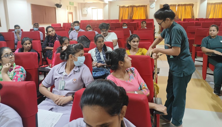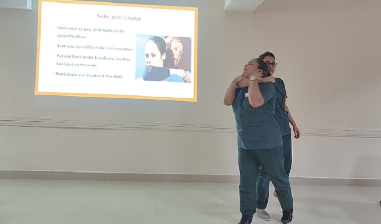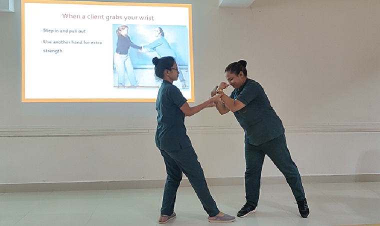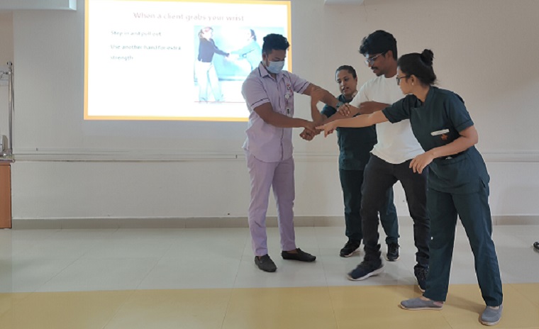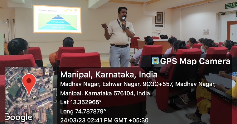 Ms. Riva Das II year MSc nursing student welcomed the faculty of the department of Psychiatric Nursing and the participants to the program. Dr. Binil V, Associate Professor, Department of Psychiatric Nursing, MCON, MAHE, Manipal was the resource person. He explained the importance of having knowledge of aggression management to protect self and the patients. He also emphasized that by using proper skills and techniques nurses can prevent violence and protect themselves from aggressive patients. During the session, many self-defense techniques were demonstrated by the MSc nursing students to the participants. A total of 35 staff nurses from Kasturba Hospital, Manipal attended the session. The vote of thanks was proposed by Ms. Sumalatha. P, II year MSc nursingr student.