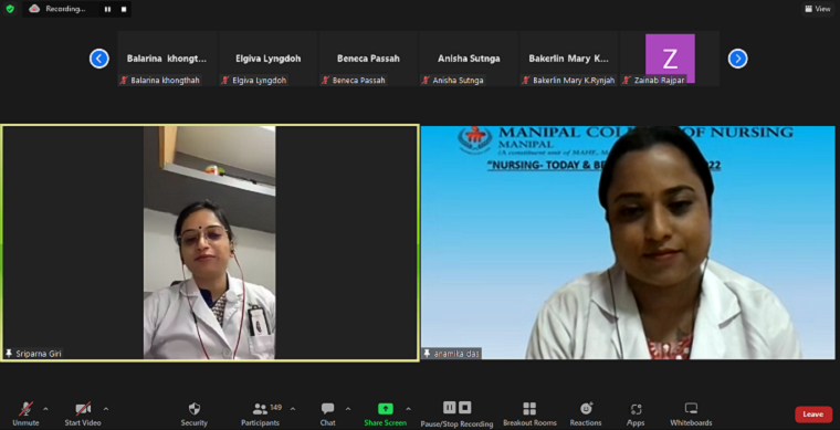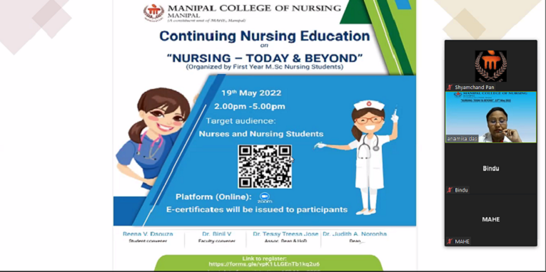 A National level Continuing Nursing Education Programme (Virtual mode in zoom platform) on “Nursing - Today and Beyond” was organized by the First Year MSc Nursing students of MCON, MAHE, Manipal on 19th May 2022 from 2 pm - 5 pm as part of their nursing education curricular requirement. Dr. Binil V, faculty convenor welcomed the gathering. The Chief Guest for the occasion was Prof. Lorna Moxham, UOW, Australia. She deliberated on the importance of nurses in various expanded and extended roles and how nurses can grow in their profession. Dr. Judith A Noronha, Dean, MCON emphasized nursing as a profession where in the future nurses have to keep caring as their focus amidst technological advancement. Nurses today are faced with various challenges, and they have to strive for excellence while providing comprehensive care to patients.
