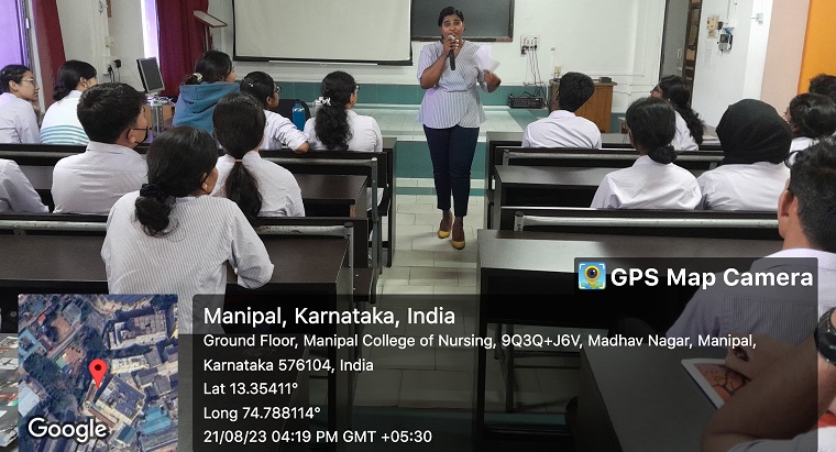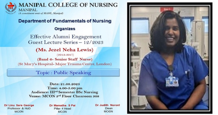 The Department of Fundamentals of Nursing organized a guest lecture on “Public Speaking” on 21st August 2023, between 4.00-5.00 pm for the 3rd Semester BSc Nursing students at Manipal College of Nursing as part of Effective Alumni Guest Lecture Series -12/2023. The speaker for the session was Ms. Jezel Neha Lewis, an alumnus of the BSc Nursing 2013-2017 batch. This session aimed to create awareness and sensitize the students to engage with an audience through skillful communication.