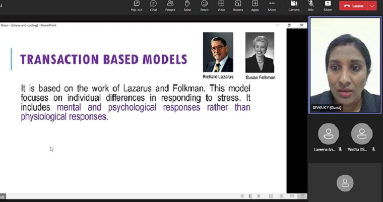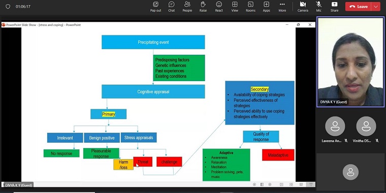 The session was deliberated by Mrs. Divya KY (MSc Alumna 2007-09 Batch), who is presently working as a Lecturer, at the Department of Community and mental health, College of Nursing, Sultan Qaboos University, Sultanate of Oman. The topic– ‘Stress Adaptation’. The beneficiaries were a total of 140 undergraduates of MCON, MAHE, and Manipal. She stressed the importance of one being aware of the various stressors and the reaction to the same in the form of general adaptation syndrome (GAS) and local adaptation syndrome (LAS). She also discussed, how a student nurse can handle the various stressful experiences faced by them. The students participated very actively in the session.