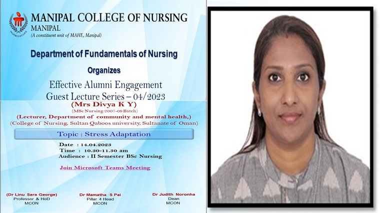 The Department of Fundamentals of Nursing organized an effective alumni engagement guest lecture (series 4/2023) on April 14, 2023, from 10.30 to 11.30 am at Manipal College of Nursing (MCON), Manipal Academy of Higher Education (MAHE) through MS teams online platform for 2nd semester BSc Nursing students.