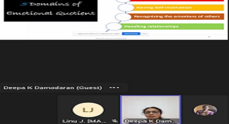 The resource person was Dr. Deepa Damodaran, Associate Professor, Dept. of Psychology, Jain University, Kochi Campus. She interacted with the students by giving activities on goal setting, ways of thinking, and how to stay motivated. She said, trust, respect, and glory are the pillars of relationships and the 5 domains of the emotional quotient are being self-aware, managing emotions, having self-motivation, recognizing the emotions of others, and having relationships. Explained about building emotional intelligence. She further said resilience is the ability to bounce back from adversities. Control, challenge, and commitment are the basis of resilience.