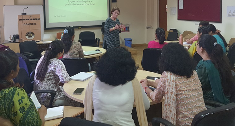 Dr. Toni Bewley, a senior teaching fellow at Edgehill University, UK, and an adjunct faculty of Manipal College of Nursing, addressed the PhD scholars on a qualitative research method, Appreciative Inquiry (AI), on January 15, 2024, at 10:30 AM.