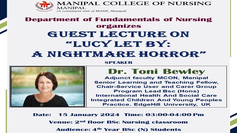 Dr. Toni Bewley, a senior teaching fellow at Edgehill University, UK, and an adjunct faculty of Manipal College of Nursing, delivered a talk for 4th year BSc Nursing students on the topic of Lucy Letby: A Nightmare Horror on January 15, 2024, at 3:00 PM.