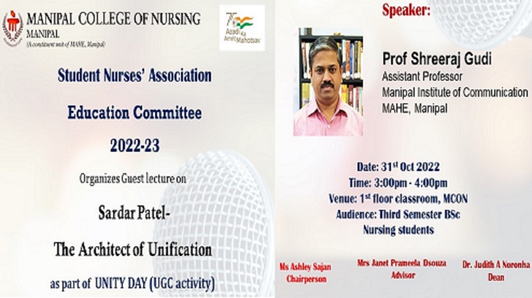The Education Committee of Student Nurses’ Association 2022 -23 of Manipal College of Nursing Manipal has organized a Guest Lecture on the theme "Sardar Patel- The Architect of Unification” on 31st October 2022 between 3:00 pm & 4:00 pm as part of University Grant Commission (UGC) activity. Mr. Shreeraj Gudi, Assistant Professor, Manipal Institute of Communication, MAHE, Manipal was the resource person. He spoke about Unity in diversity, how independence was brought, the Indian Independence Act, and its recommendations. He emphasized about the British rules and how Sardar Patel played a pivotal role in uniting the country.