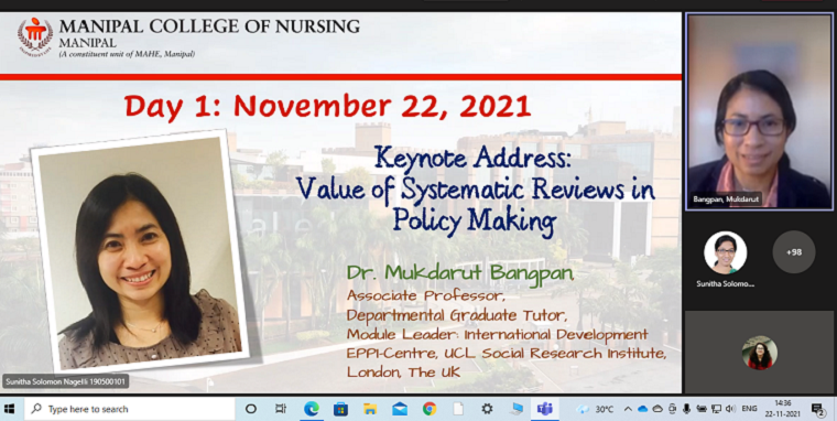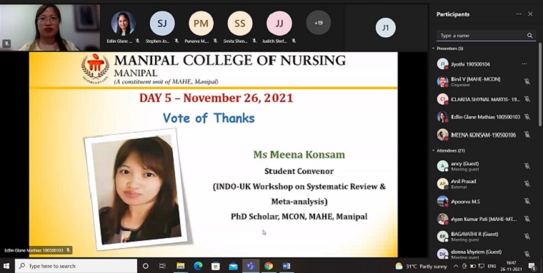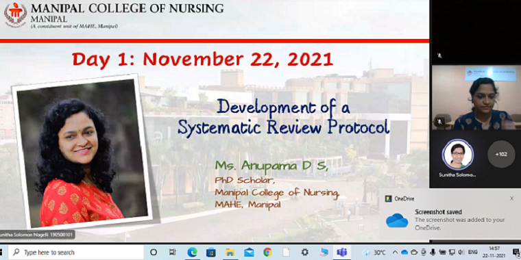 Manipal College of Nursing, Manipal Academy of Higher Education, Manipal, organized the INDO - UK workshop on Systematic Review and Meta-analysis through the virtual mode from 22 November 2021 to 26 November 2021. This workshop was supported by the financial grants from SPARC & UKEIRI SPARC support programme.