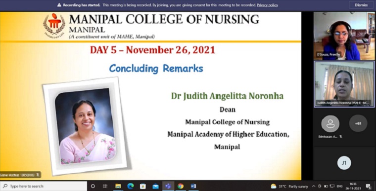 The concluding remarks of the five-day workshop was given by given by Dr Judith A. Noronha, Professor and Dean, MCON, MAHE, Manipal. Ms Meena Konsam, Research Scholar and student convenor, Manipal College of Nursing, MAHE, Manipal, proposed the vote of thanks. Participants actively participated in all the sessions. Last days sessions were technically coordinated by Ms Edlin Glane Mathias, Research Scholar, MCON, MAHE, Manipal and the faculty coordinator for the day was Dr Baby S Nayak, Professor & Head, Department of Child Health Nursing, MCON, MAHE, Manipal.