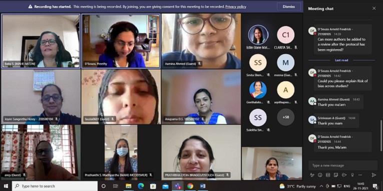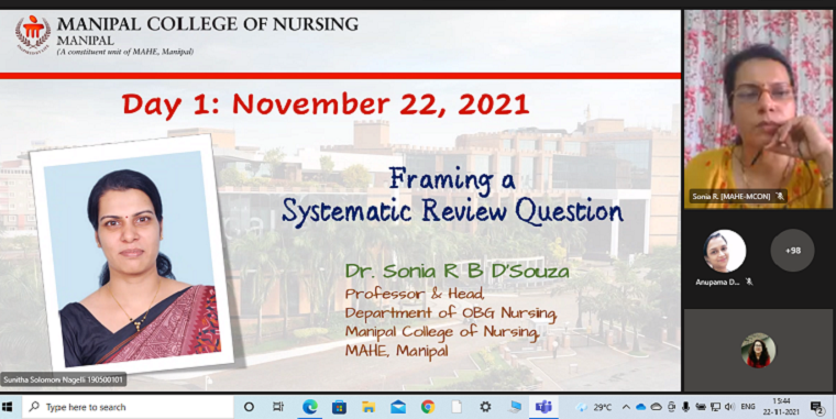 The last session for the day was on –‘Framing a systematic review question’- by Dr Sonia R.B D’Souza Professor & Head, Dept. of OBG Nursing, MCON, MAHE, Manipal. Dr Sonia stated that just like every journey starts from baby steps, a systematic review should be started by framing the research question. She explained in her talk about formulating answerable systematic review questions and discussed the question formation framework- PICO, the purposes of PICO, components of SR questions and also gave examples for SR questions. The session ended with the chat-based discussion activity along with the audience. The first day’s sessions ended with good comments from the audience. Around 102 delegates participated in the session. The session was moderated by Ms Sunitha Solomon Nagelli, Research Scholar, MCON, MAHE, Manipal; technically coordinated by Ms Monalisa Saikia,