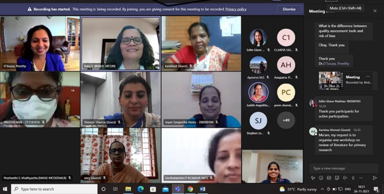 On the 4th day, the first session was on ‘Data collection’ deliberated by Ms Tenzin Phagdol, PhD Scholar MCON, MAHE, Manipal. The speaker explained about what data to collect, how to use or design data collection tools and how to extract the data. The second session was on ‘Assessing risk of bias’ taken by Dr Judith A. Noronha, Professor and Dean MCON, MAHE, Manipal. She explained the risk of bias and scales used to check the risk of bias, RoB tools were also explained in detail. The day ended with another excellent session on ‘Systematic review of Qualitative studies’ by Dr Sunita Panda, Lecturer, School of Nursing and Midwifery, University College Cork & Research Fellow in Trinity College, University of Dublin, Dublin, Ireland. Dr Sunita explained about the quality appraisal, data extraction, and thematic analysis, dissemination of the data and the challenges in detail. The session was moderated by Ms Henita Joshna Menezes, Research Scholar, MCON, MAHE, Manipal; technically coordinated by Mr N Siva, Research Scholar, MCON, MAHE, Manipal and Dr Sonia R.B D’Souza, Professor & Head, Dept. of OBG Nursing, MCON, MAHE, Manipal was the faculty coordinator.