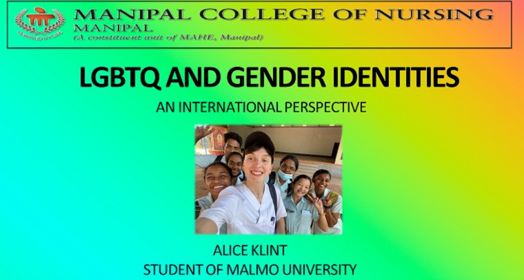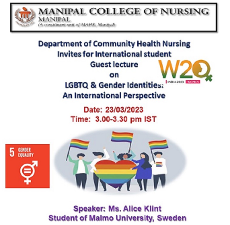 As part of SDG 5 gender equality, the Department of Community Health Nursing organized an International student guest talk on LGBTQ: An international perceptive by Ms. Alice Klint, a Nursing student of Malmo University on 23rd March 2023 from 3.00 to 3.45 PM at Manipal College of Nursing, MAHE, Manipal. Dr. Shashidhara YN, Professor & Head, Dept of Community Health Nursing MCON, introduce the speaker to the audience. Ms. Klint explained what is LGBTQ and how they are different from each other, and how they should be pronounced as he/she/ they/zi with appropriate examples. Ms. Alice also explained the rights of LGBTQ in Sweden, in contrast with India, and concluded with a question and answer session with a reference to social organizations. Dr. Shashidhara concluded and expressed gratitude to Ms. Alice for her efforts in organizing the event. About 60 participants attended the program, both offline and online.
