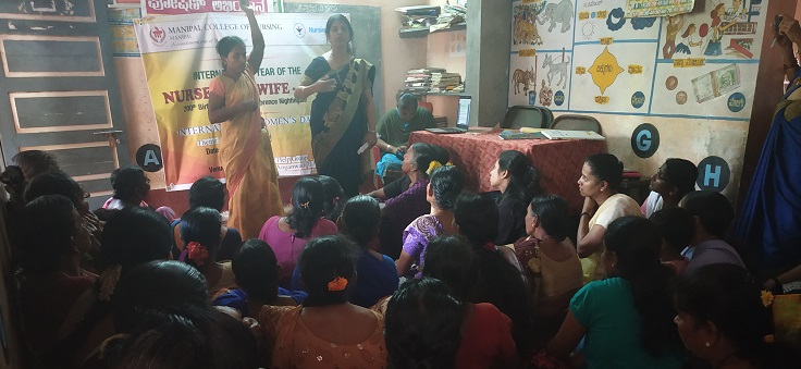 Mrs. Pratibha Kamath and Mrs. Ranjani P Assistant Professors, Department of OBG (N), MCON, MAHE, Manipal addressed 50 women of Stree Shakthi from 80 Badagabettu village on the theme #Each for equal and also spoke on early identification of reproductive tract cancer its myths, prevalence in the community, symptoms, diagnostic modalities including self-breast examination, need for early initiation of health checkup and seeking prompt treatment. As a part of community sensitization, interactive session on “Coronavirus disease (COVID-19)”, was also taken by explaining signs and symptoms as well as the preventive measures to overcome this infectious disease. Mrs. Shantha, Anganwadi Teacher welcomed the gathering and Ms. Henita Joshna Menezes, Ph.D. Scholar, MCON, MAHE, Manipal proposed vote of thanks. Mrs. Indira, Supervisor, Women and Child welfare, 80 Badagabettu, witnessed the program.