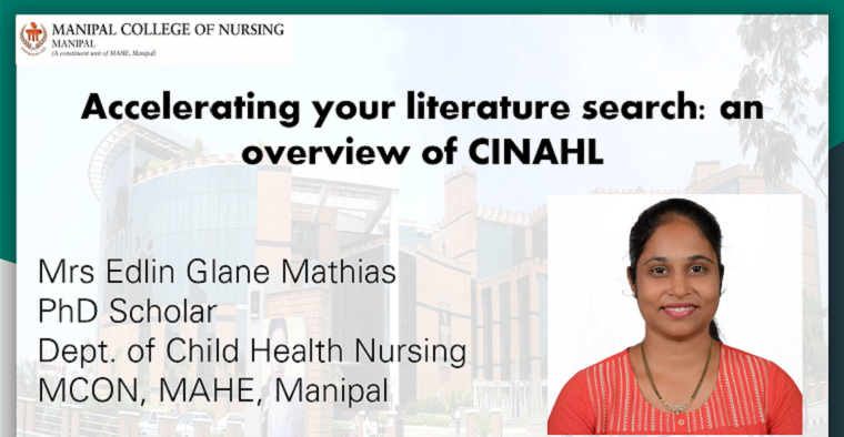 Manipal College of Nursing-Student Research Forum, MAHE, Manipal, organized the sixth session of the year-long webinar series ‘Inculcating Research Culture in Students’ on the topic - Accelerating your literature search: an overview of CINAHL on 23rd October 2021, from 3:00 pm to 4:00 pm. The resource person for the session was Mrs Edlin Glane Mathias, PhD Scholar, Dept. of Child Health Nursing, MCON, MAHE, Manipal.