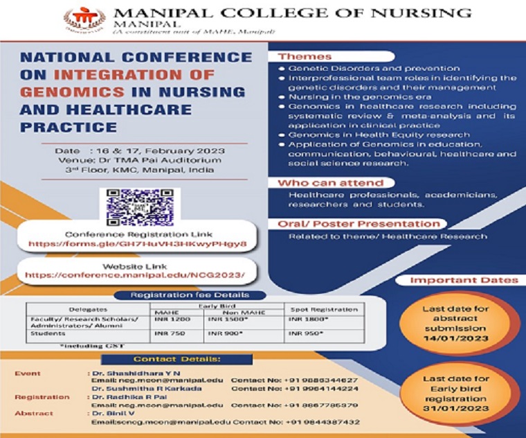 Manipal College of Nursing, MAHE, Manipal is organizing a National Conference on Integration of Genomics in Nursing and Healthcare Practice on 16th and 17th February 2023.