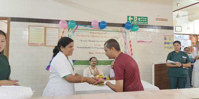 On 10th Oct 2023, morning various competitions were conducted for the inmates of the psychiatry ward, Kasturba Hospital, Manipal by the MSc(N) and PBBSc(N) students. After that, a formal programme was organised in the ward. Dr. Tessy Treesa Jose welcomed the gathering. Dr. Ravindra Munoli, Associate Professor, Department of Psychiatry, KMC Manipal was the chief guest for the programme. Dr Ravindra highlighted in his speech that “Mental health” is a responsibility of everyone. Everyone should take preventive measures before the occurrence of the disease. He also emphasized following the fundamental human right to daily living. Prizes for the winners were distributed during the programme.
