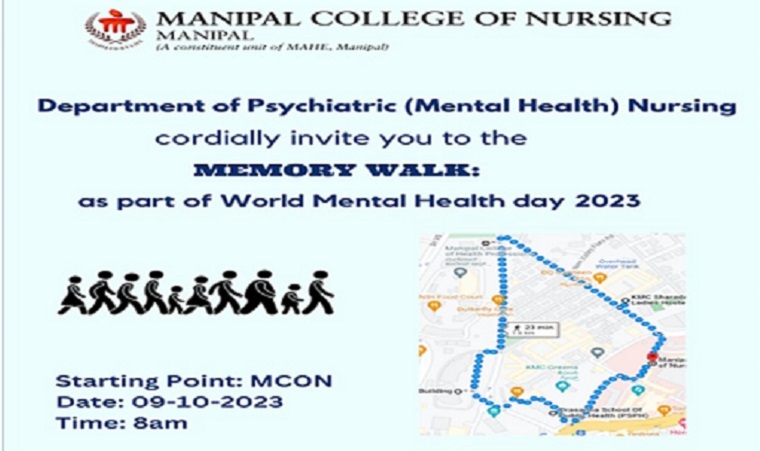 As part of creating awareness among the public on the day and theme a ‘Memory walk’ was organised on 9th Oct 2023. Dr. Tessy Treesa Jose, Associate Dean and HoD, Psychiatric (Mental Health) Nursing highlighted the significance of observing World Mental Health Day. She flagged off the memory walk. The faculty, research scholars and students from 2nd year MSc(N) speciality, II Year PBBSc (N) and 3rd year BSc(N) participated in the programme.