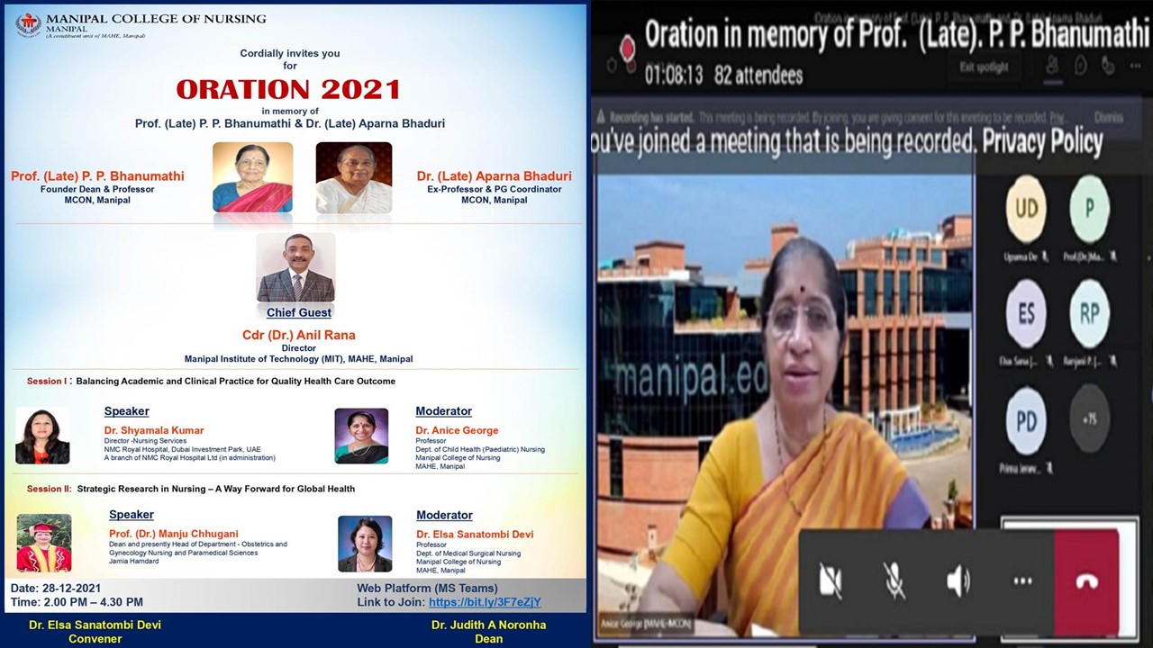 Manipal College of Nursing, Manipal organized Oration - 2021 on 28th December 2021, in memory of legends in Nursing, Prof. (Late) P. P. Bhanumathi, the founder Dean of MCON and Dr. (Late) Aparna Bhaduri, a world-renowned nurse researcher and the PG Coordinator at MCON MAHE.