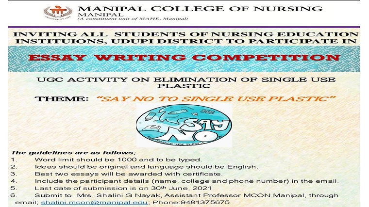 Manipal College of Nursing, MAHE, Manipal has organized an essay writing competition in the month of June 2021 for the students of nursing education institutions of Udupi District on the theme “Say No to Single-Use Plastic”. A total of ten essays were received. Students have narrated about the effects of plastic on the environment, the rationale for stopping the single-use plastic and creative thoughts and ideas on strategies to stop the use of single-use plastic. Essays written by Ms Helena Maria Prasad, first-year BSc Nursing of Manipal College of Nursing, Manipal Academy of Higher Education and by Ms Thrupthi, First Year GNM student of Vidhyarathna School of Nursing of Udupi were awarded as best essays.