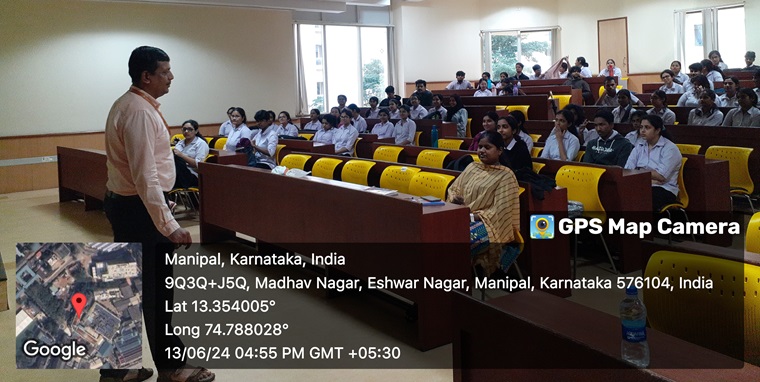The Department of Medical-Surgical Nursing, Manipal College of Nursing, MAHE, Manipal, in collaboration with the Division of Yoga, Centre for Integrative Medicine and Research (CIMR), MAHE, Manipal, conducted a guest lecture on June 13, 2024, as part of International Day of Yoga 2024. The topic for the Guest Lecture was “Yoga for Women Empowerment”. Dr Neetinakumar Patil, Associate Professor, Division of Yoga, CIMR, MAHE, Manipal, was the resource person. It was conducted at Interact Lecture Hall for fourth-semester BSc Nursing students. A total of 138 participants, including students and faculty, attended the session. Dr. Neetinakumar Patil explained the definition of yoga, the purpose of yoga, the four paths of yoga, and the sequence of yoga sessions. He emphasized pranayama, meditation, mindfulness, and relaxation, concepts of yoga in connection with mind, emotion, sense organs, stress, and multitasking; and its significance for nursing professionals. He highlighted the benefits of yoga for women and the enhancement of women’s well-being through yoga. The session was deliberated along with many relevant examples and a practice session of pranayama.