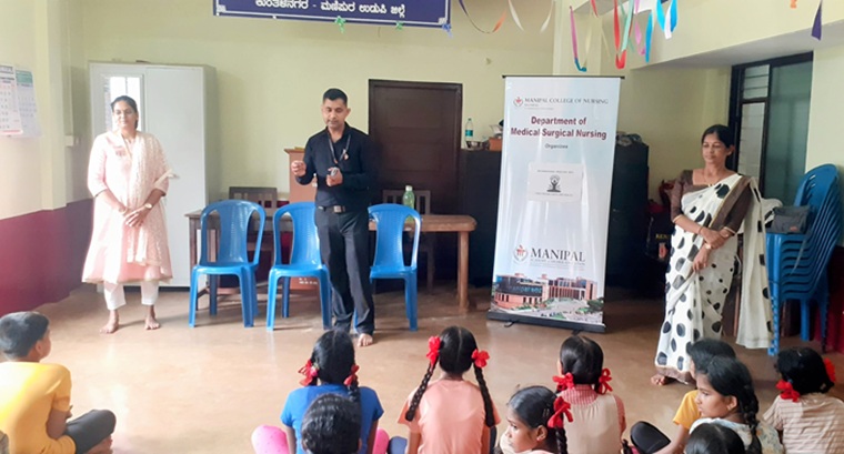 As a part of International Yoga Day 2025, the department of Medical-Surgical Nursing, MCON, MAHE, Manipal, organized an engaging yoga awareness session on 20th June 2025 at Bharathi Higher Primary School, Kunthalanagara, Manipura, Udupi District. The session was held between 3:00 PM & 4:00 PM. Mrs. Poovitha Shruthi Paramashiva, Assistant Professor, Division of Yoga, Centre for Integrative Medicine and Research (CIMR), MAHE, Manipal was the resource person. Mrs. Poovitha addressed the participants on the significance of International Yoga Day and briefed them about the health benefits of yoga. The students of 6th and 7th standard were part of the programme and were guided through the various yoga postures and a brief meditation session. The interactive and inspiring session drew participation from 40 attendees, including school teachers. The programme highlighted the role of yoga in promoting physical and mental well-being, contributing to the Sustainable Development Goals (SDGs)-Good Health and Well-being (Goal 3), and Quality Education (Goal 4). The days activity concluded with the distribution of snacks to all the children, leaving them energized and motivated. Overall, the program was coordinated by Mr. Raghavendra Nayak, Lecturer and Mrs. Janet Prameela D’Souza, Assistant Professor-senior scale, under the guidance of Dr. Jyothi Chakrabarty, Professor and Head, department of Medical-Surgical Nursing, MCON.
