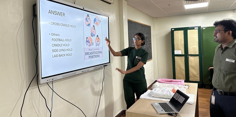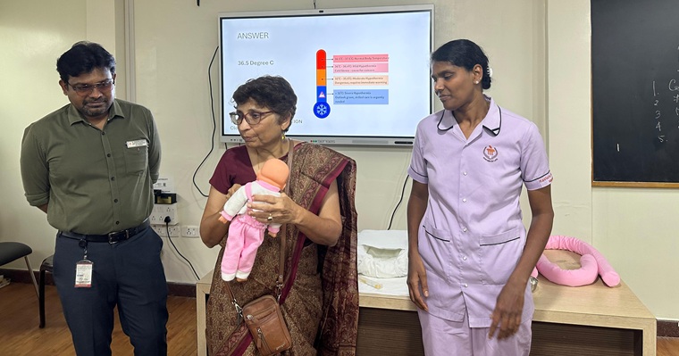 Dr. Sheila Samanta Mathai, Professor & Head, Department of Neonatology, KMC, Manipal, provided a brief overview of the program and highlighted the importance of the theme. An interactive question and answer session was organized for the semester V BSc Nursing students, MSc Nursing students of MCON, MAHE, Manipal, and staff nurses from the neonatal, antenatal, and postnatal units of Kasturba Hospital, Manipal, to strengthen their knowledge of essential newborn care practices. Dr. Subhodh Shetty, Associate Professor, Department of Neonatology, KMC, Manipal, was the resource person. A total of 20 students and 26 staff nurses demonstrated enthusiasm and actively participated in the discussion. Following this, a comprehensive newborn care workshop on the theme was conducted by the team of staff nurses. The nurses demonstrated key newborn care practices to enhance their knowledge and practical skills related to newborn care. The first session focused on Developmental Supportive Care, with its components of Kangaroo Mother Care and nesting, demonstrated by Ms. Pramila, Ms Rakshitha, Ms Dakshayini, and Ms Anushka. The second session was aseptic non-touch technique (ANTT) by Ms Sudharshini, Ms. Chaithanya, and Ms, Ann Mary. They demonstrated the proper techniques for hand washing, intravenous hub management, and preparation of intravenous fluids and total parenteral nutrition under laminar airflow (LAF) conditions. The last session of the workshop focused on assessment and the positions of breastfeeding, paladai, and katori feeding by Ms. Shashikala, Ms Ashwini, and Ms Susanna.