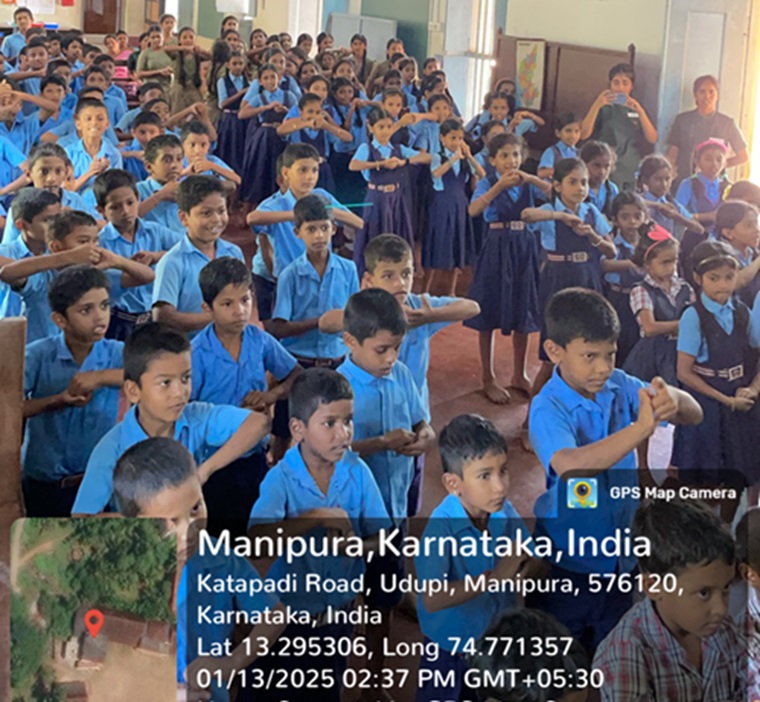 The interactive session was conducted by Ms Nishmitha Shettigar, a BSc nursing student on Healthy Lifestyle and Personal Hygiene, followed by an action song on hand hygiene involving all the students present there. Dr. Malathi G. Nayak demonstrated pranayama techniques to all the students.