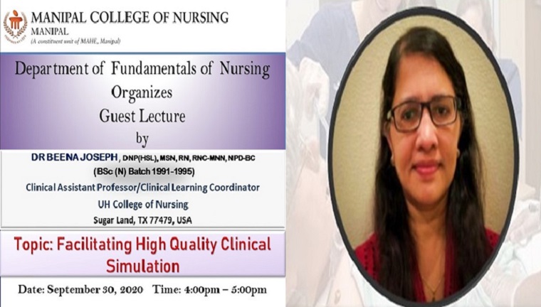 Department of Fundamentals of Nursing, Manipal College of Nursing, Manipal Academy of Higher Education, Manipal organized a Guest Lecture on “Facilitating high-quality virtual simulation” on September 30, 2020, between 4.00 pm to 5.00 pm for faculty members through Microsoft Team Platform. Dr Beena Joseph, Clinical Assistant Professor and Clinical Coordinator, University of Houston, College of Nursing, Houston, Texas, USA, and adjunct faculty, MCON, MAHE Manipal, was the resource person.