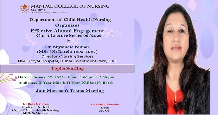 Department of Child Health Nursing Manipal College of Nursing, MAHE, Manipal had organized a guest lecture on the topic “Staffing” by Dr Shyamala Kumar Director -Nursing Services NMC Royal Hospital, Dubai Investment Park, UAE on 07 February 2022 at 1:00 pm through MS Teams platform.
