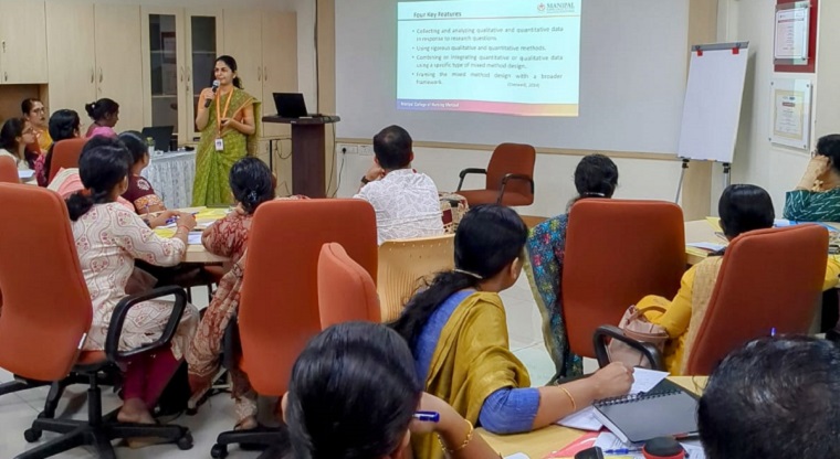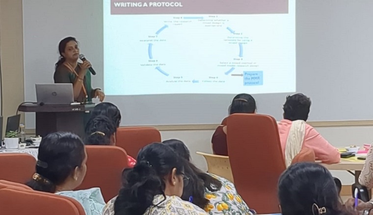 The First session of the day, the introduction to mixed methods research, was delivered by Dr. Linu Sara George, Professor, and Head, Department of Fundamentals of Nursing, MCON, Manipal. She elaborated on mixed methods research, methodological characteristics, advantages, and challenges. Dr. Shradha S. Parsekar, an independent research consultant, delivered the second session on mixed methods research study design. She focused on the rationale of using mixed methods, data collection strategies, and various MMR designs. The post-lunch session on developing a protocol for mixed methods research was delivered by Dr. Anupama D S, Research Fellow Department of Global Health Governance, Prasanna School of Public Health MAHE, Manipal. She emphasized the steps of protocol development, including the conceptual framework. The last session of the day was a hands-on session on developing goals and protocol for a mixed methods study facilitated by Mr. Anil Raj, Assistant Professor, Department of Medical-Surgical Nursing, MCON Manipal, and Ms. Mitchelle S Lewis, Lecturer, Department of Fundamentals of Nursing,