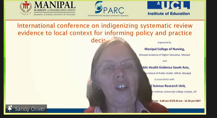 Searching Indian resources for evidence on contraception was elaborated by Dr Shradha S. Parsekar and Dr Eti Rajwar, Former Research Officers, PHESA, PSPH, MAHE, Manipal. Indigenizing evidence for local context was dealt by Prof. Sandy Oliver, Professor of Public Policy IOE- Social Research Institute UCL Institute of Education London, UK was moderated by Dr Anice George, Professor, Dept. of Child Health Nursing, MCON, MAHE, Manipal