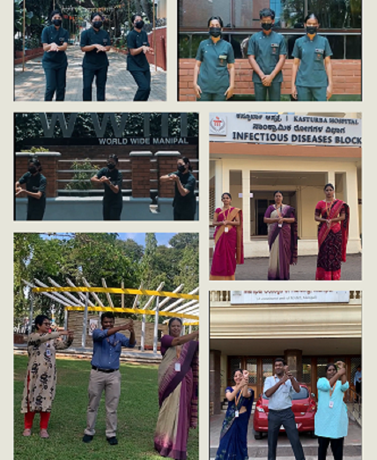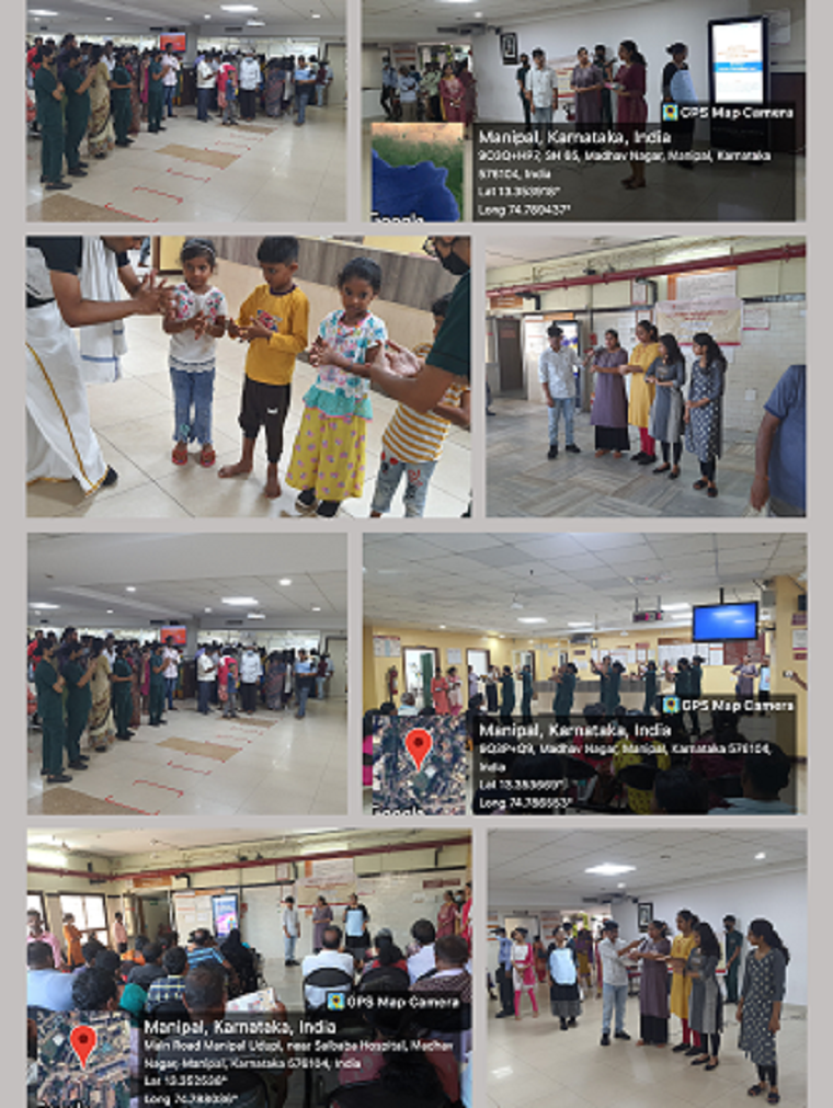 A roleplay spreading awareness on the importance of hand hygiene along with a dance on hand hygiene steps was done by the students of the second semester to create awareness among the patient and patient attendees in the three Outpatient department areas (Main OPD Block, Shirdi Saibaba Cancer Center, Women, and Child Block) of the Kasturba Hospital Manipal. At the end of the program, a pocket card with hand washing steps from WHO was distributed among them. There was a good response from the viewers, and some actively came forward to demonstrate the same.