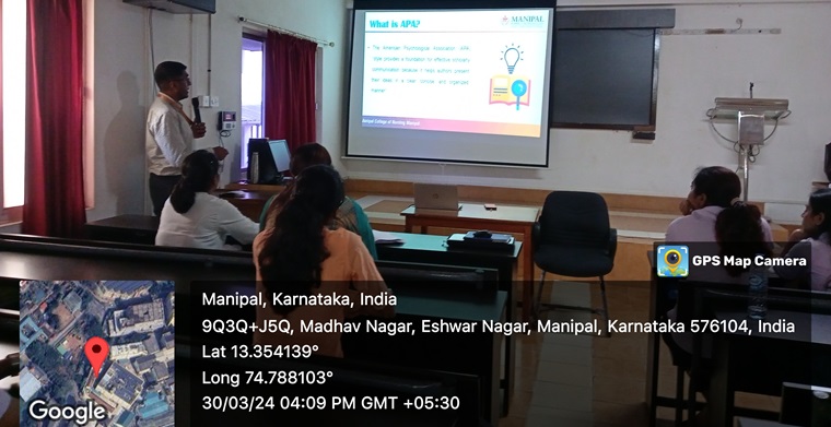 The Student Research Forum of Manipal College of Nursing, MAHE, Manipal, conducted the fourth session of the year-long lecture series on ‘APA Guidelines (How to write and cite)’ on March 30, 2024, from 4.00 p.m. to 5.00 p.m. The resource person for the session was Mr. Anil Raj, Assistant Professor, Department of Medical-Surgical Nursing, Manipal College of Nursing, MAHE, Manipal. The session focused on attaining SDG 4: Quality Education. Mr. Anil elaborately explained the topic and how to cite references from journals and books with examples. The session was very inspiring and informative and was well-appreciated by the participants. A total of 70 participants, including undergraduate and postgraduate students, Ph.D. Scholars, and project staff of MCON, attended the session. E-certificates were given to all the participants.