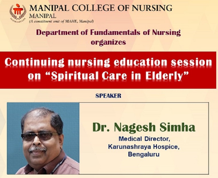 A continuing nursing education session on “Spiritual care in Elderly" by Dr. Nagesh Simha, Medical Director, Karunashraya Hospice, Bengaluru was organized by the Department of Fundamentals of Nursing, MCON, MAHE Manipal through MS teams’ online platform on the 3rd September 2022 between 2.00 & 3.00 pm.