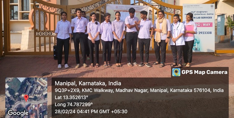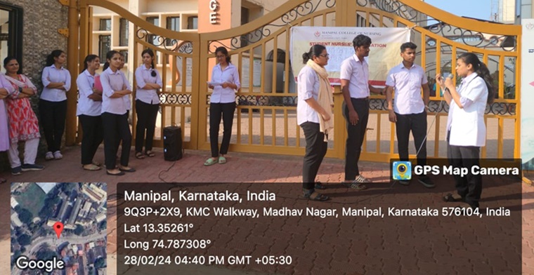 The use of tobacco, alcohol, and other substances is a global problem and affects many children and adolescents. To create awareness about drug abuse through drama and humour, team members of the SNA health education committee of MCON presented a street play on “drug abuse” on February 28, 2024, at 4:30 pm near the main gate of KMC. The team mainly portrayed the ill effects of substance abuse and the remedial measures. The total beneficiaries were 20 participants, and they appreciated the efforts of the team. The program was coordinated by committee advisors, Mrs. Shobha, Lecturer, Department of OBG (N), Mrs. Rishmitha, Lecturer, Department of Medical-Surgical Nursing, and the committee secretary, Ms. Sona Mariya Jose, a student of Semester V. The program contributed to SDG3: good health and well being