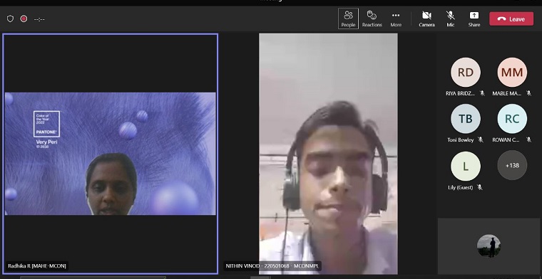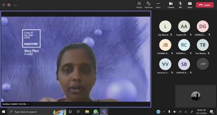 This experience-sharing session was followed by a small presentation on “Stress and Anxiety” by Dr. Tony Bewely, Senior Lecturer & Program Coordinator, School of Nursing, Edgehill University, UK & Adjunct faculty of MCON, MAHE and Dr. Radhika R Pai, Assistant Professor, Department of Fundamentals of Nursing, Manipal College Nursing (MCON), MAHE, Manipal discussed on “Reducing stress with Yoga.” A total of 117 students actively participated in the session ( 99 from MCON and 18 from Edgehill University).