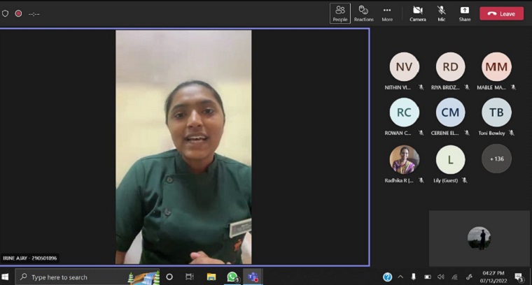 Ms. Mable Mary Mathews, Ms. Irene Ajay, Mr. Nithin Vinod, and Ms. Cerene Elza Mathew students from Manipal College of Nursing, Manipal, shared the challenging clinical experiences and how they managed to overcome the stress experienced during the same. Experience sharing from MCON students was mainly focused on overcoming the language barrier in clinical practice, better communication techniques to handle patients and relatives smoothly as well as maintaining ethics in clinical practice.